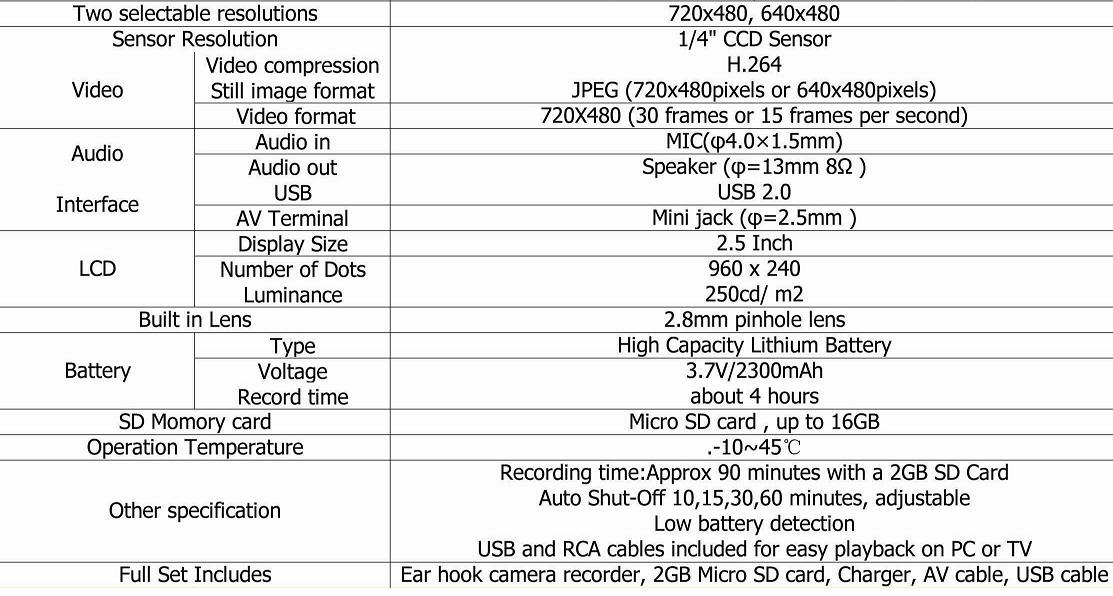 This device comes with a camera that can be clipped on clothing or worn by ear. The DVR records video and audio on a SD card. The camera is wired to the DVR but can be easily hidden by clothing.
